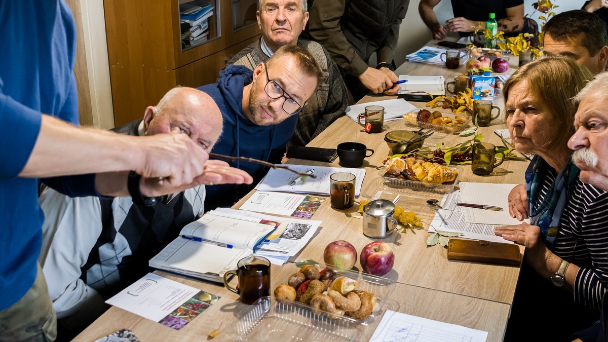 Część teoretyczna była bogata w wiedzę na temat starych odmian. Prowadzący zaprezentował liczne odmiany jabłoni, grusz i innych drzew owocowych, charakterystyczne dla sadów tradycyjnych. Uczestnicy mieli wyjątkową okazję do degustacji owoców, które Pan Szymczak przywiózł prosto ze swojego sadu, co było smacznym i praktycznym uzupełnieniem wykładu.