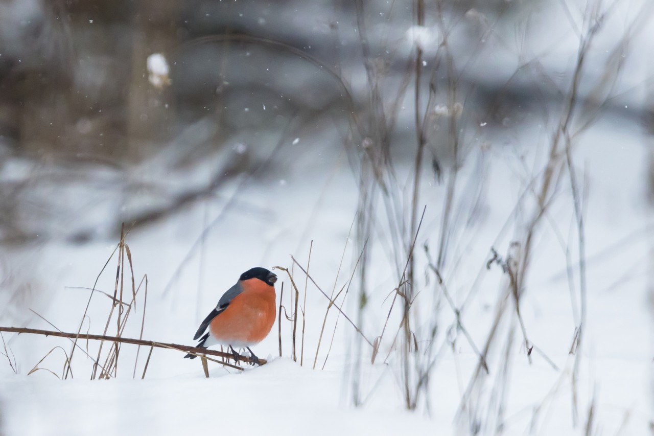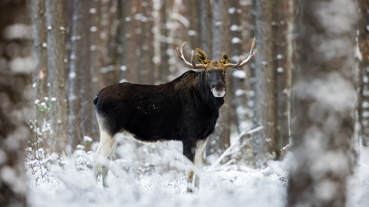 - W lesie, pośród ośnieżonych sosen, można dostrzec majestatyczną sylwetkę łosia, a na białym tle śniegu zastygłe w bezruchu kosy, kwiczoły oraz czerwieniące się jak dojrzałe owoce gile.